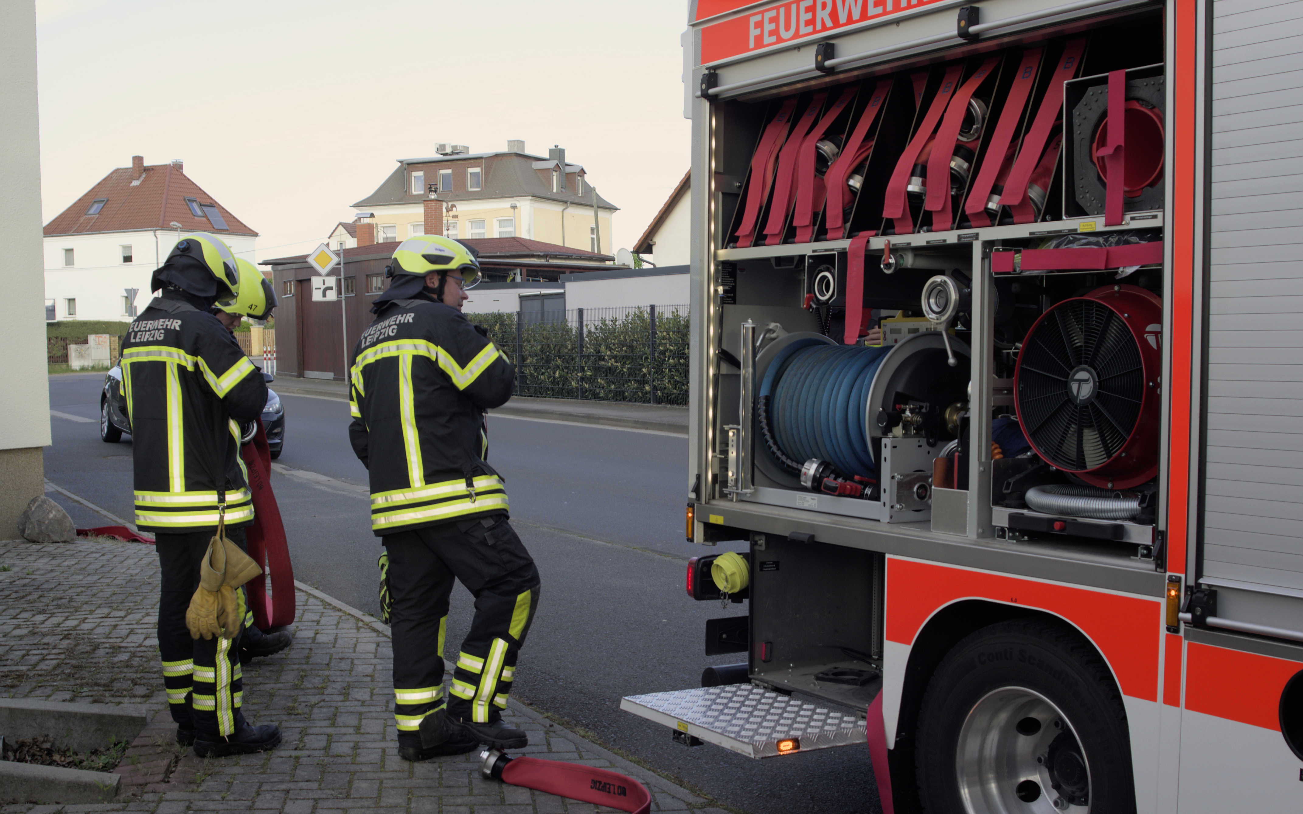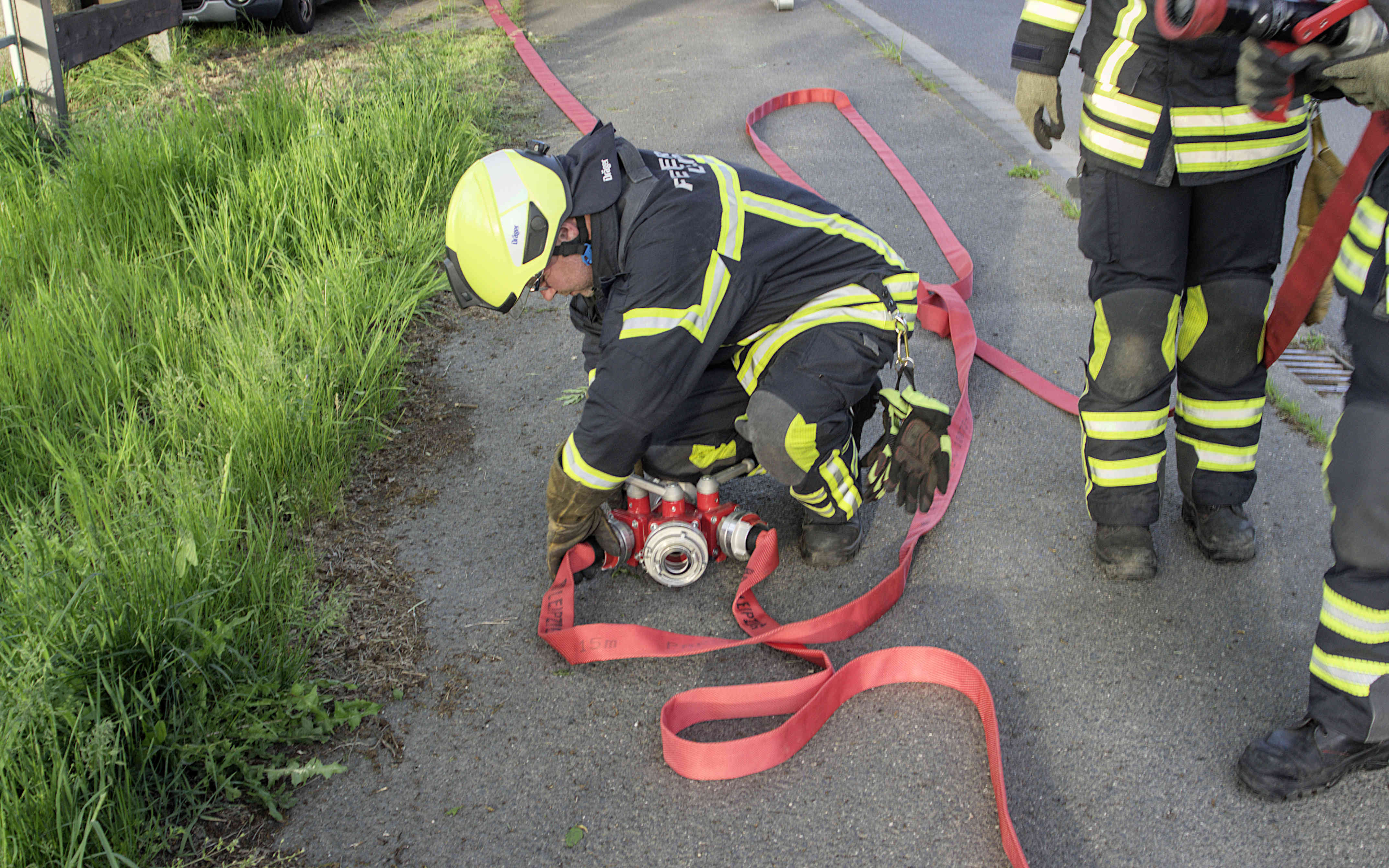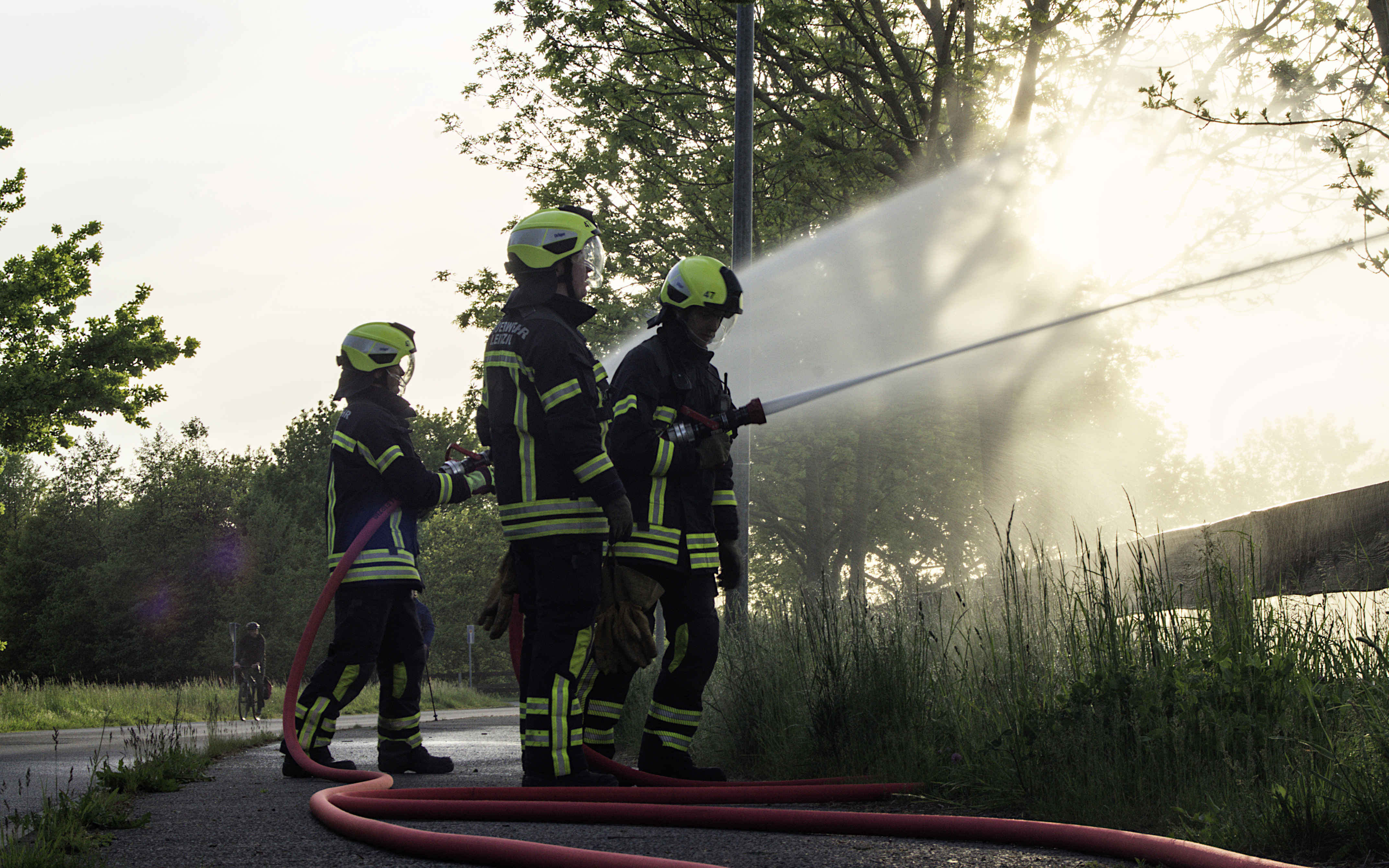Und wenn wir mal nicht die Wiese eines Landwirts bewässern, müssen wir vor einer richtigen Brandbekämpfung natürlich noch die örtlichen und meteorologischen Verhältnisse beachten. Sind Menschen vom Brand bedroht, kann das Feuer auf angrenzende Gebäudeteile übergreifen und wo treibt der Wind Flammen oder brennendes Material hin. Manchmal werden giftige Dämpfe freigesetzt, da müssen unsere Kameraden den passenden Atemschutz anlegen und die Umgebung vor der Gefahr warnen. All das lässt sich natürlich nicht in einer technischen Übung proben. Das ist Teil anderer Übungen.