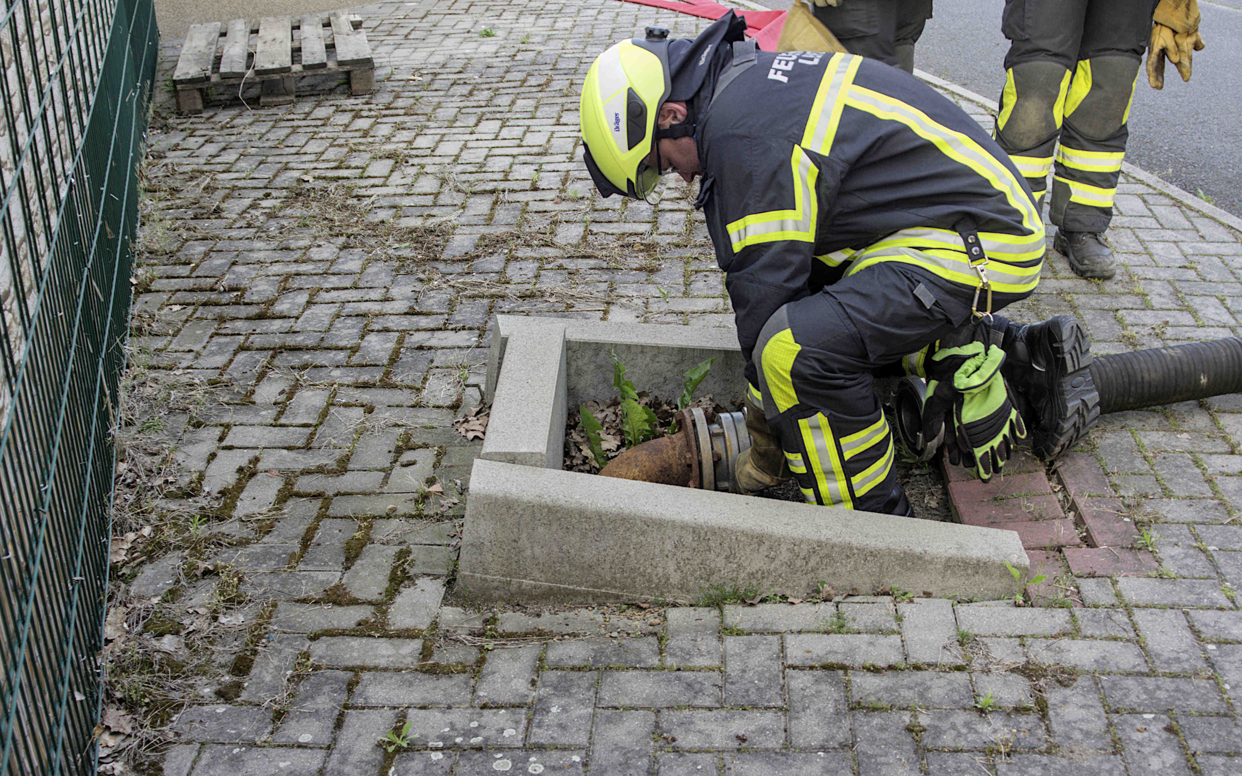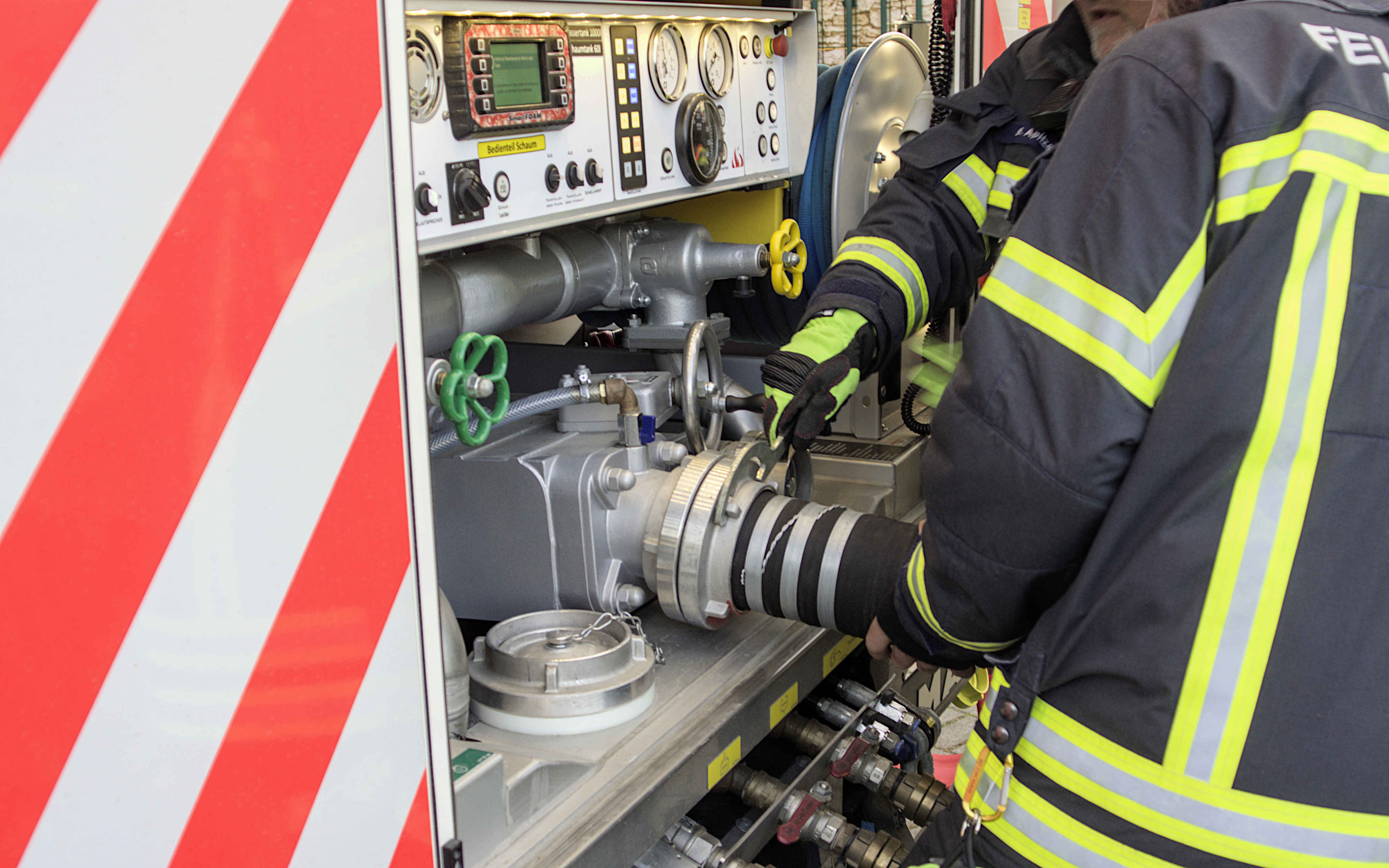 In dieser Übung wurde ein Löschwasserbrunnen verwendet. Dazu musste eine Saugleitung zwischen der Entnahmestelle und dem Löschfahrzeug installiert werden. Das Fahrzeug fungiert in diesem Fall als Pumpe, die das Wasser des Brunnens an die Schlauch-Verteiler der Löschschläuche pumpt. Zwei Angriffsteams simulierten einen parallelen Angriff auf einen imaginären Brand.
